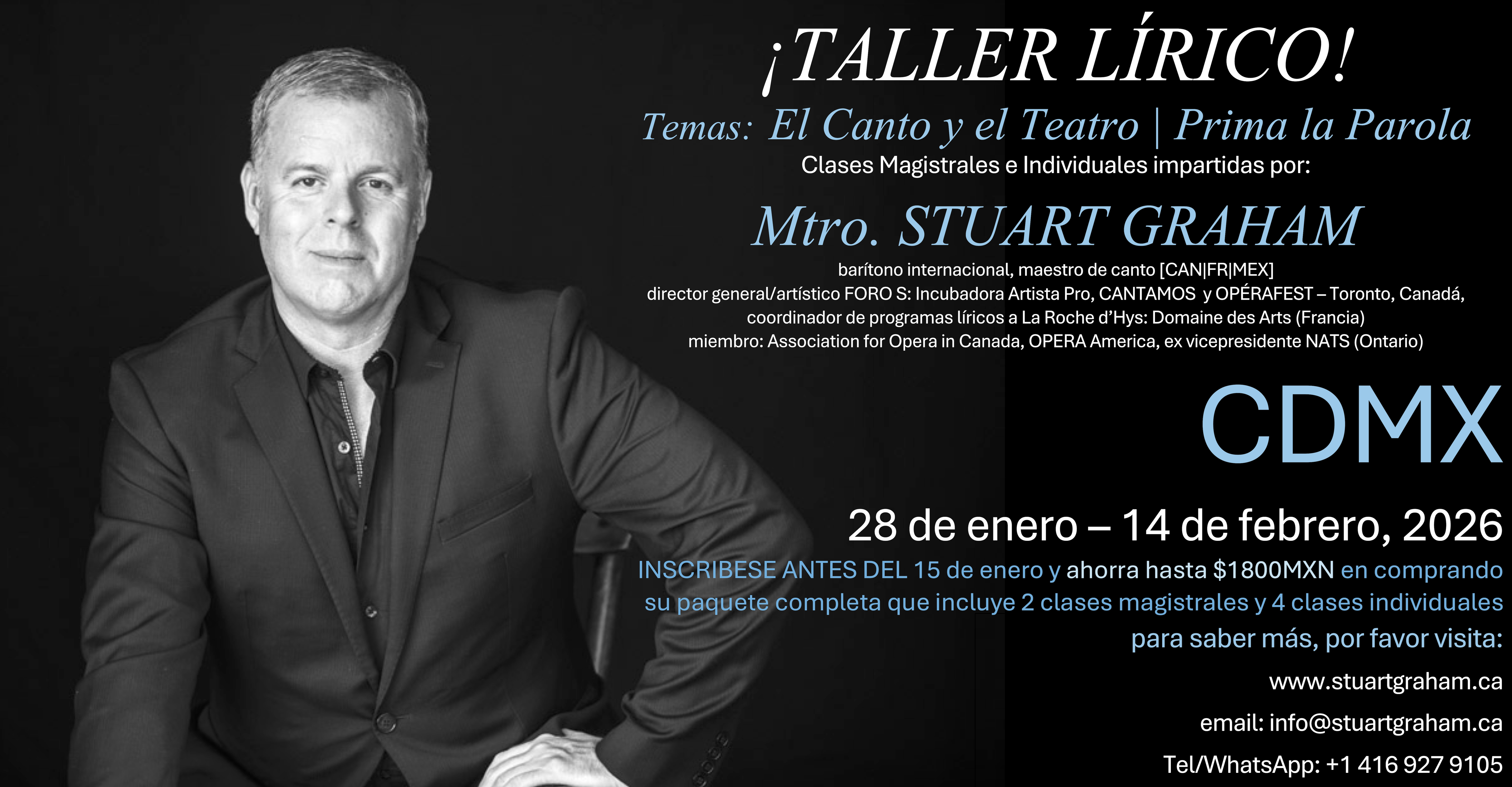 Es con mucho gusto que anuncio mi siguiente estancia y taller lírico en la CDMX entre las fechas del 28 de enero hasta el 18 de febrero, 2026. Esta vez les ofrezco una propuesta de estudio más enfocada sobre los temas: